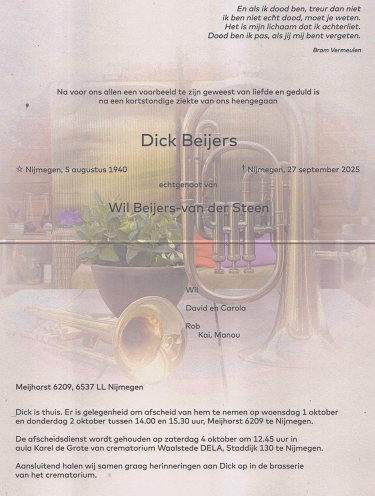 Dick mocht je rekenen tot een zeer actief lid van onze vereniging. Jarenlang moest je bij hem na de bardienst, de opbrengst in de brievenbus stoppen, waarna hij, na het nodige telwerk, er voor zorgde dat dit op onze bankrekening gestort werd. Daarnaast is hij jarenlang actief geweest in de accommodatiecommissie. Door zijn kennis en kunde was hij daar van grote waarde. Ook bij het Smash Benefiet Open is hij jarenlang een ondersteunende kracht geweest. Door zijn rustige en stille persoonlijkheid viel hij niet op. We wensen Wil, de kinderen, kleinkinderen en verdere familie veel sterkte de komende dagen. We gaan hem missen.